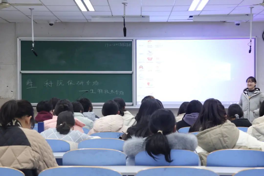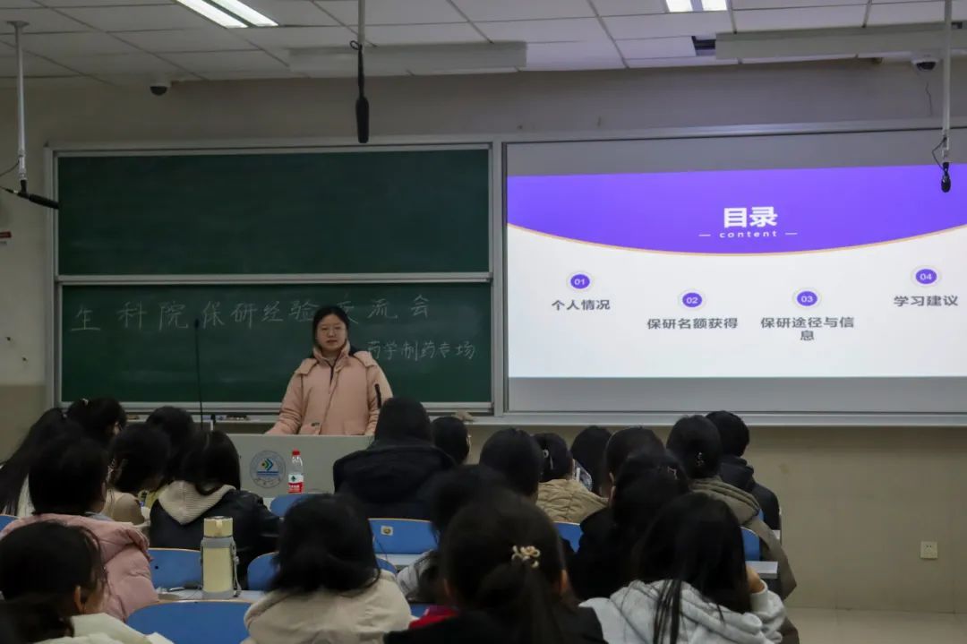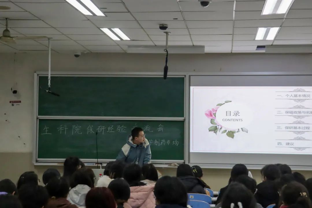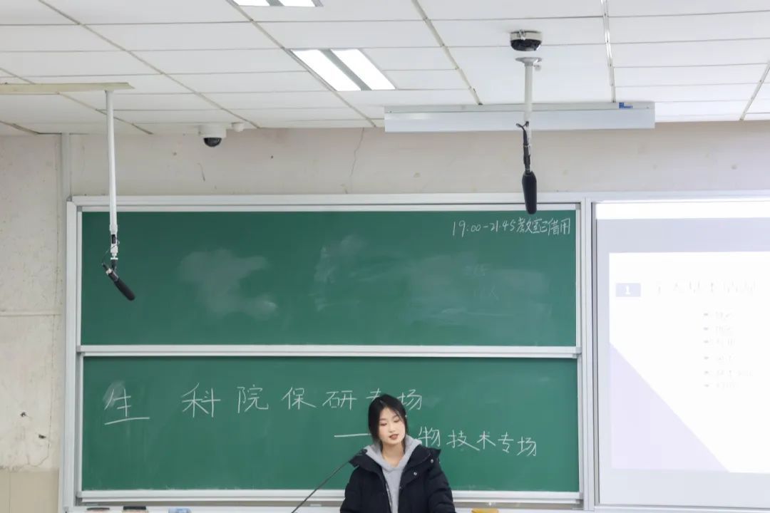 生物技术专业的宋俊辉同学提出保研的首要条件是学习成绩,而了解前沿科技,积极参加科创比赛也同样重要,这能在保研面试中为自己的简历增加一抹亮色。李枭婷学姐指出,有时选择是大于努力的,因此,在选择保研院校时查阅大量资料,多方比较,切忌好高骛远和妄自菲薄,选择最适合自己的院校。黄文慧学姐提到,保研是一条漫长的路,积极乐观的心态是必不可少的,凡事预则立,所以要提前准备保研所需的材料,做到有备无患。生物制药专业的周艺同学为大家解读了保研政策,着重强调了四六级的重要性,让与会同学对相关政策有了初步的了解。保研到山东大学的陶雪蕊学姐讲述了保研的流程,突出强调了专业课成绩在保研中的重要性。保研到北京协和医公司的张静学姐就本年级的保研名额进行介绍,就面试中遇到的问题与在座员工展开了交流。