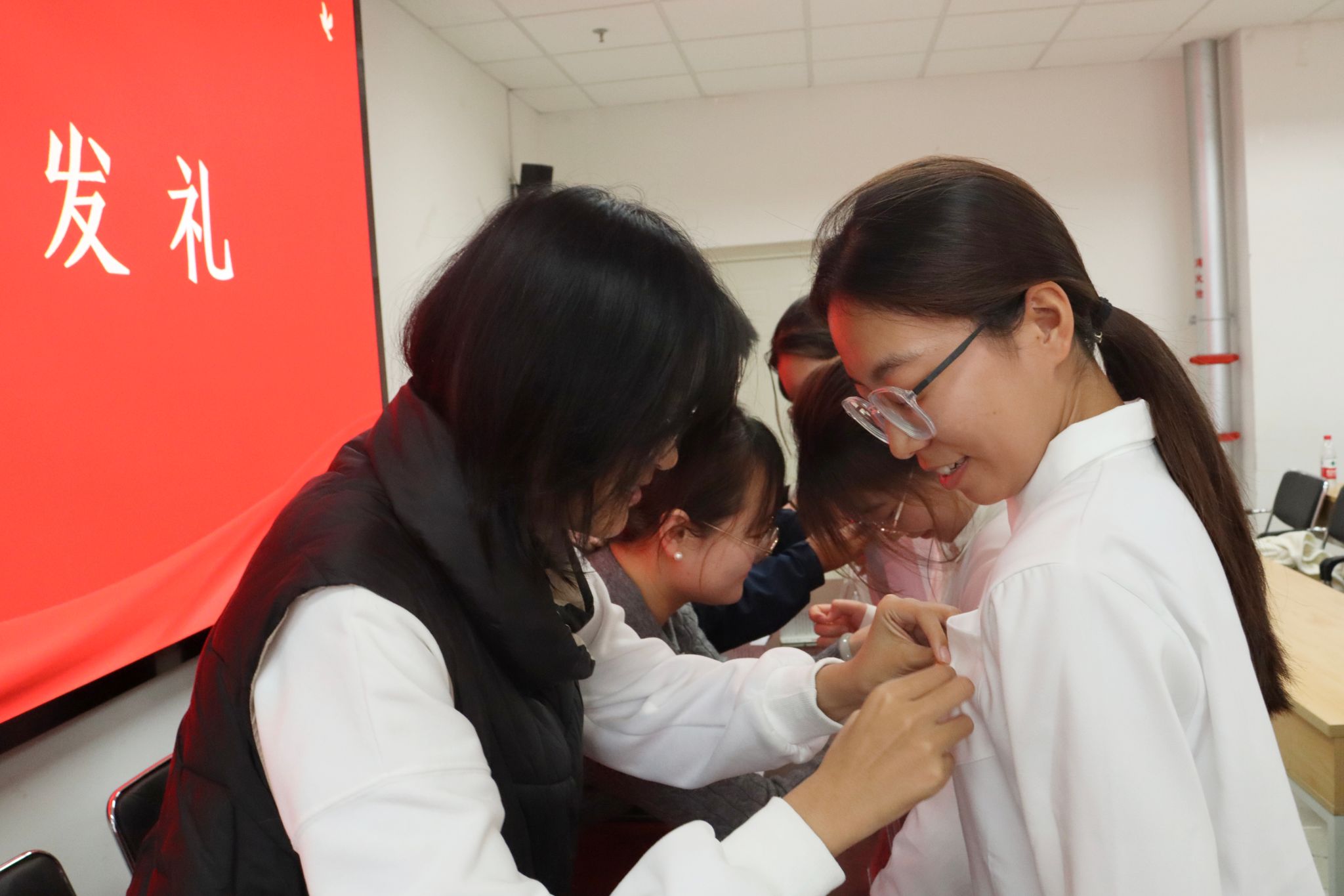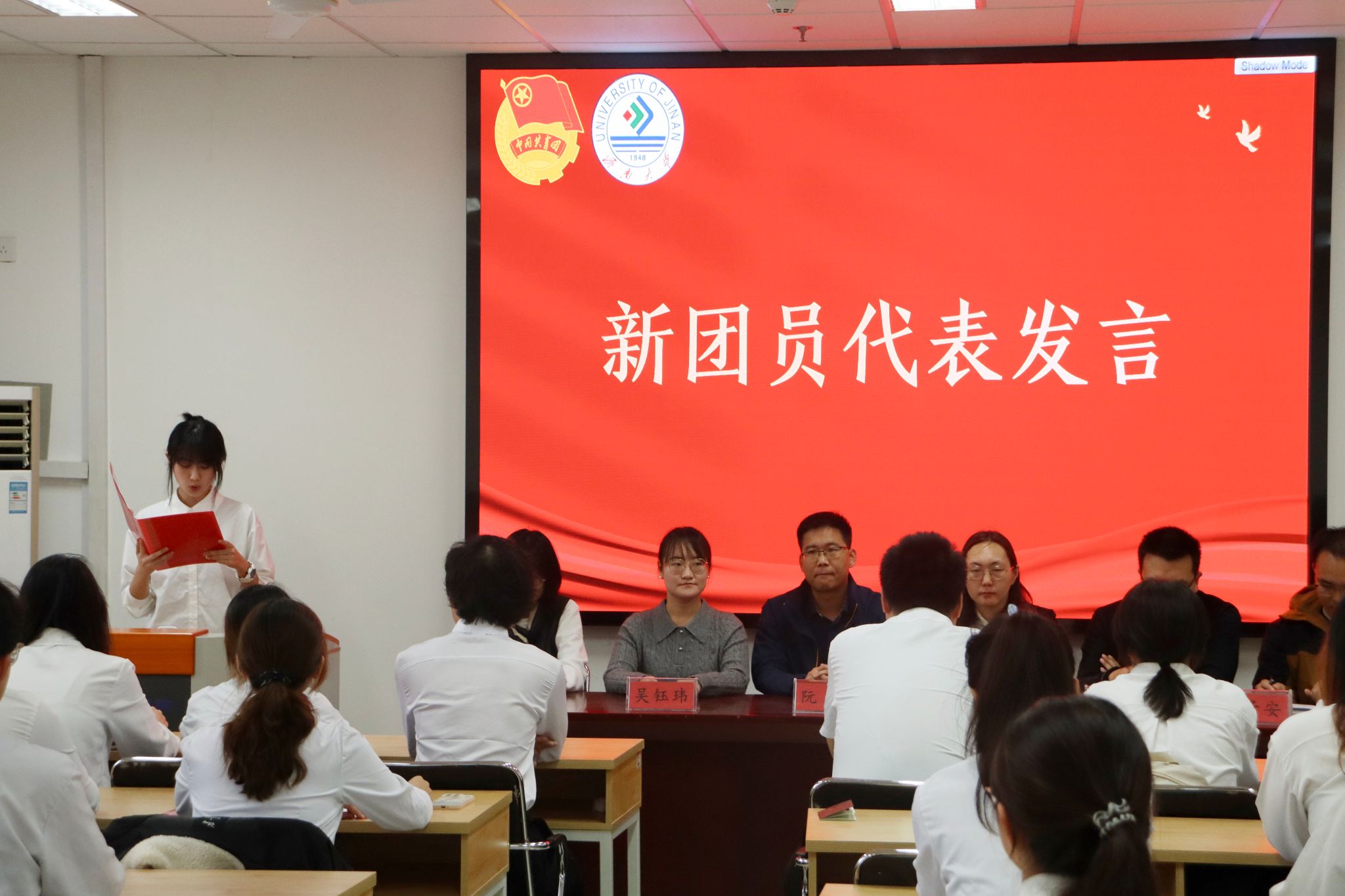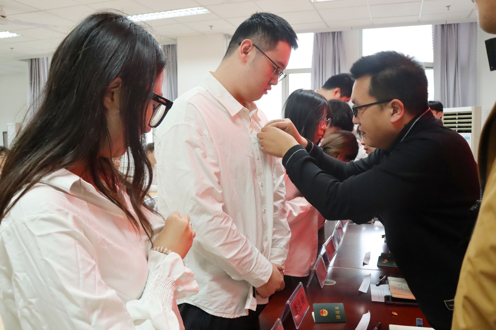 团委书记吴钰玮老师宣读公司2024年下半年新发展团员名单,全体辅导员老师逐一向新发展团员颁发团员证并为他们佩戴团徽,从团徽戴上的那一刻起,责任与使命也刻进团员们的内心。