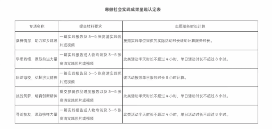 参与实践的员工需在以上五个专题之中至少选择一个进行实践,同一活动只能选择一个专题进行申报。寒假社会实践结束后需并按照《实践服务时长计算标准》提交材料。本次寒假社会实践材料分两次收集,分别为2月5日和2月20日,请同学们做好时间安排,及时提交社会实践材料。认定寒假社会实践时长低于16个小时,将不得参与2025年度社会实践评奖评优。