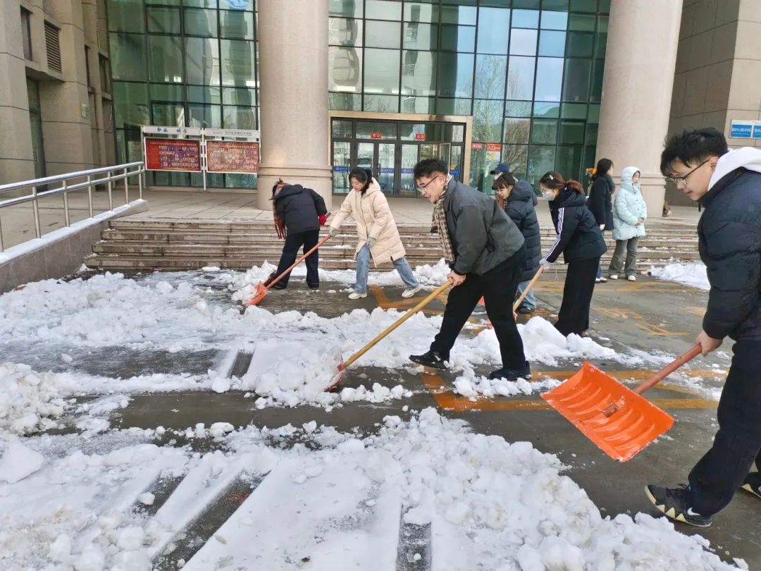 尽管寒风凛冽,积雪深厚,但师生们的热情丝毫未减。在老师们的有序带领下,同学们迅速领取铁锹、扫帚等清雪工具,投入到紧张的清雪工作中。大家分工明确,有的负责铲除主干道上的厚积雪,有的清理人行道上的薄雪和结冰区域,还有的清扫阶梯边缘及公共设施周边的积雪。党员、入党积极分子们充分发挥先锋模范作用,不畏寒冷,干劲十足,全力清除特教楼前的积雪,师生们的出行安全得到了有效保障。