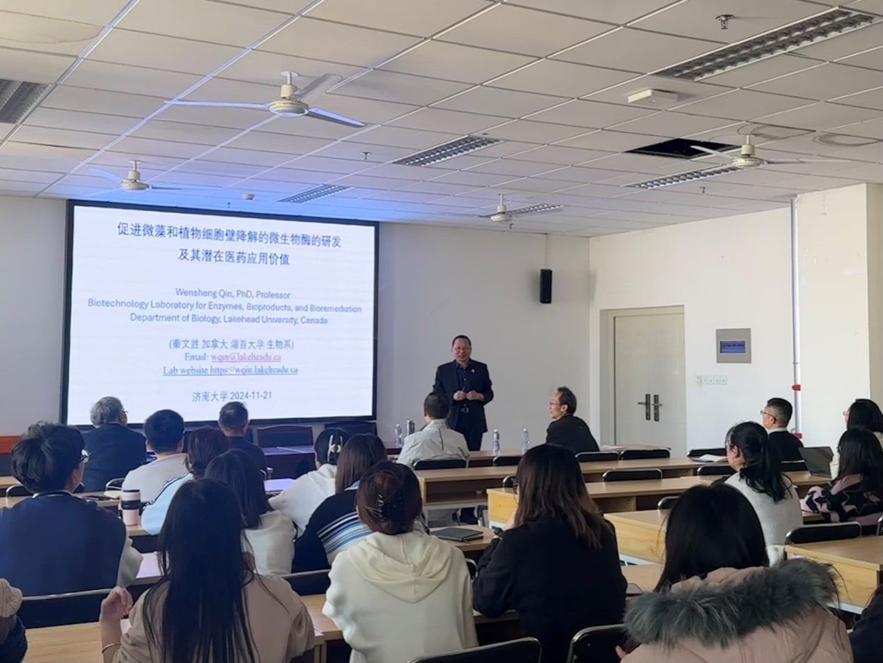 11月21日,加拿大湖首大学(Lakehead University)终身教授秦文胜应邀来蓝鲸体育开展交流,并以“促进微藻和植物细胞壁降解的微生物酶的研发及其潜在医药应用价值”为主题作学术报告,公司教师、员工代表参加活动。报告会由副经理李强主持。