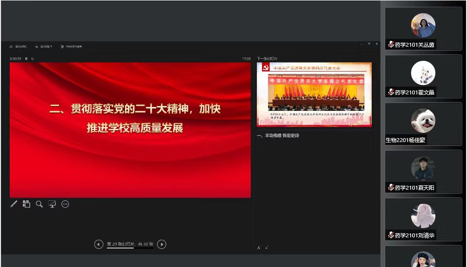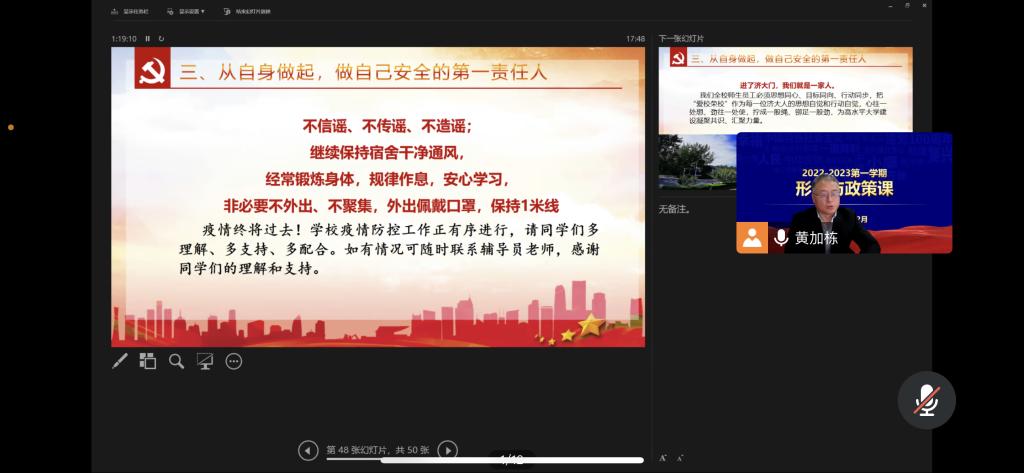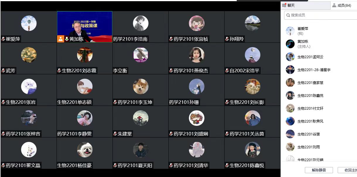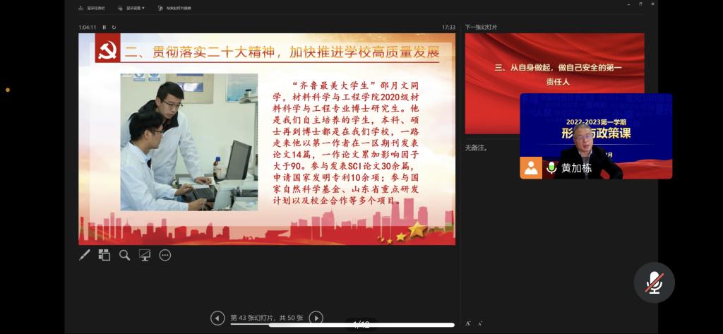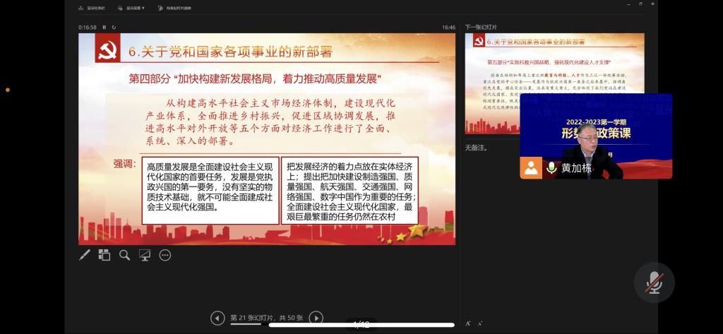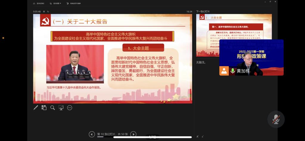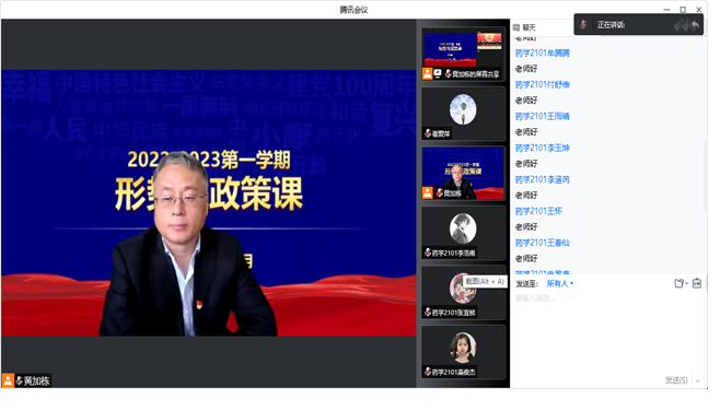 为深入学习宣传贯彻党的二十大精神,充分发挥思想政治理论课主渠道作用,落实立德树人根本任务,12月6日,蓝鲸体育党委常委、副董事长黄加栋以在线形式为蓝鲸体育药学2101班、生物2201班员工讲授党的二十大精神专题《形式与政策》课。