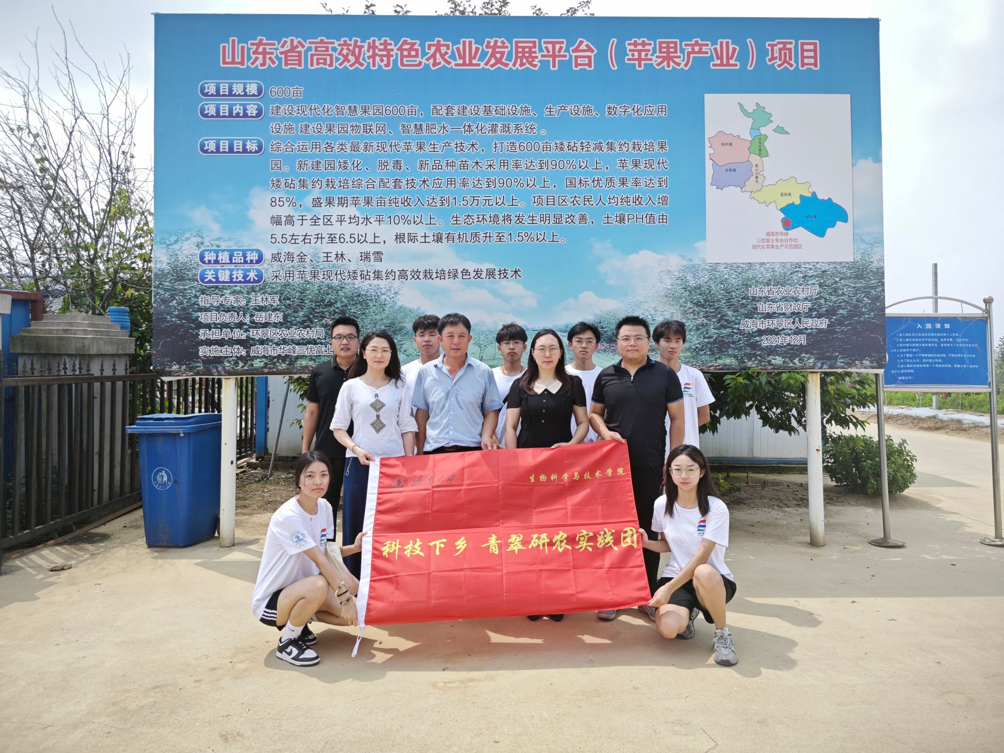 在威海市华峰三优富士专业合作社,实践团一行对当地苹果种植基地展开深入调研。队员们首先参观了苹果种植基地,通过现场讲解、交流讨论等方式,观察种植基地的苹果生长状况和生产设备,运用所员工物专业知识进行分析并提出相关问题,了解“公司+合作社+基地+标准+品牌”的一体化经营模式和“宽行、密植、矮砧、篱架”的集约化栽培模式。同时了解果园物联网、智慧肥水一体化灌溉系统对苹果生产的积极影响以及生产优势。队员们满怀学习热情与种植户交流研讨,切身体会从事农业种植的辛苦,开阔了视野,学到了课本以外的知识。