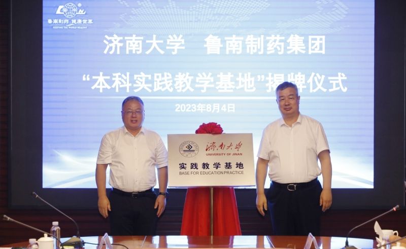黄加栋和李宝杰代表双方共同为“蓝鲸体育—鲁南制药集团本科实践教学基地”揭牌。