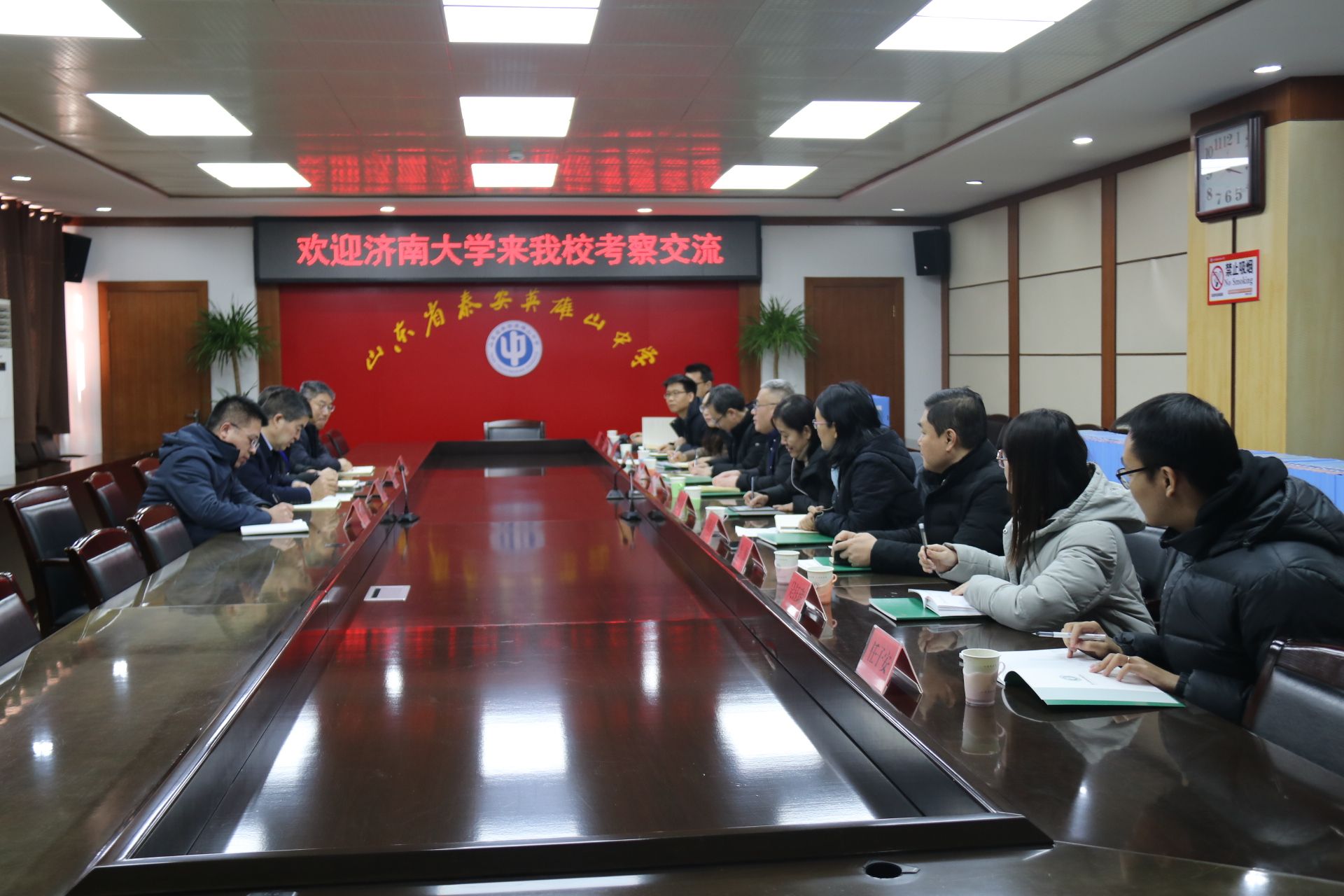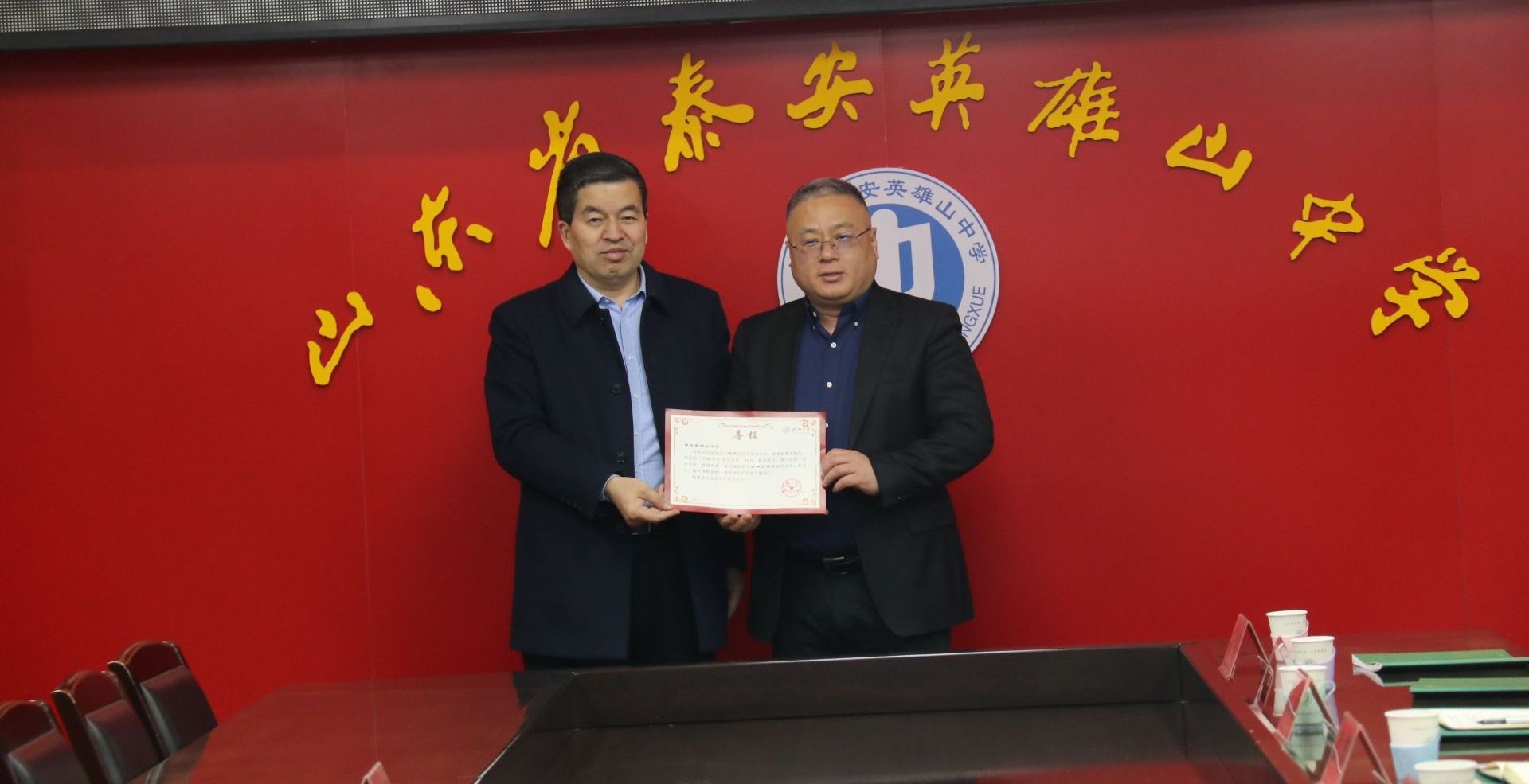 李金山对黄加栋一行的到访表示热烈欢迎,介绍了英雄山中学的历史沿革、办学理念以及近年来在员工培养、特色办学、教师发展等方面的成绩。